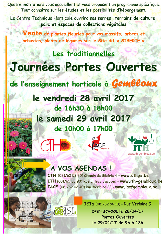 Portes ouvertes dans l’enseignement horticole de Gembloux le 28/04/2017 de 16h30 à 18h00 et le samedi 29/04/2017 de 10h00 à 17h00